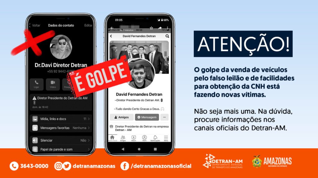 Criminosos estão utilizando a imagem do diretor técnico do Departamento Estadual de Trânsito do Amazonas (Detran-AM) para aplicar o golpe da venda de veículos por falso leilão e de facilitação para obtenção de Carteira de Habilitação. Essa não é a primeira vez que esse tipo de crime acontece.