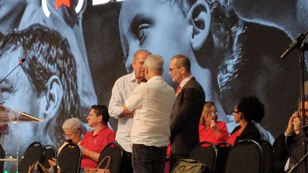 Presidente do PT por sete anos, entre 1995 e 2002, seu nome foi saudado pela atual presidente Gleisi Hoffmann no microfone, antes de sua fala, e amplamente aplaudido pela militância. Antes de o evento começar, também foi exibido em vídeo seu, recebido com gritos de “lindo”.