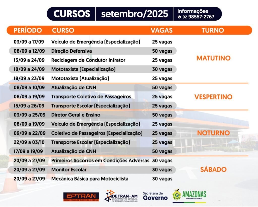 De acordo com o cronograma da Eptran, no turno matutino, o curso de Especialização para Condutor de Veículo de Emergência (25 vagas) inicia no dia 3 de setembro. O curso de Direção Defensiva (50 vagas) inicia no dia 8, e o curso de Reciclagem de Condutor Infrator (25 vagas), no dia 15. No dia 18 de setembro, também pela manhã, iniciam os cursos de Especialização para Mototaxista (30 vagas) e Atualização para Mototaxista (25 vagas).