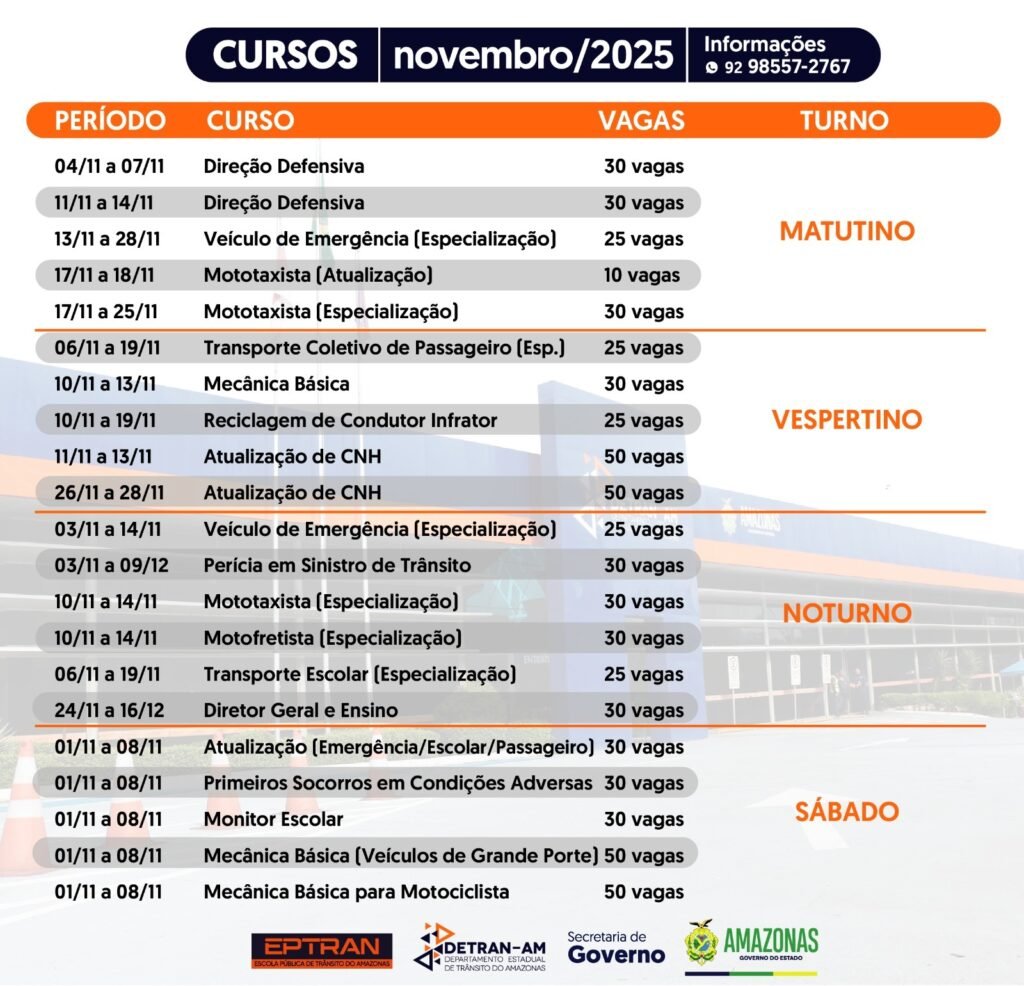 O Departamento Estadual de Trânsito do Amazonas (Detran-AM), por meio da Escola Pública de Trânsito (Eptran), abrirá no dia 21 de novembro as inscrições para os cursos gratuitos que serão realizados ao longo do mês. Serão 665 vagas disponíveis, com turmas nos turnos manhã, tarde e noite, além de opções aos sábados.