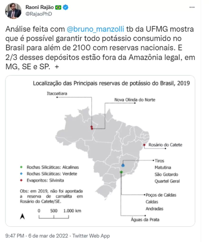 Levantamento de dois professores da Universidade Federal de Minas Gerais, Raoni Rajão e Bruno Manzolli, com as minas de potássio do país mostrou que é possível garantir todo o potássio a ser consumido no país para além de 2100 com reservas nacionais.