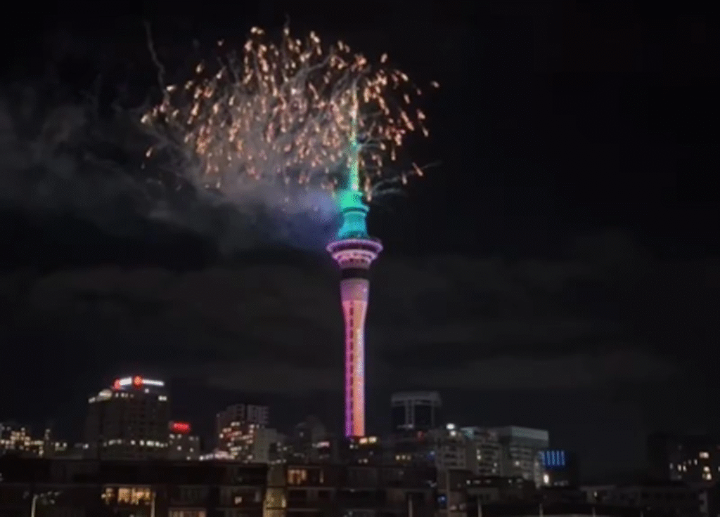 Em seguida, foi a vez de quem vive em Auckland, na Nova Zelândia, celebrar o Réveillon. O espetáculo ocorreu com a queima de fogos de artifício na Sky Tower, prédio mais alto do país. A torre de 328 metros se iluminou com fogos lançados no topo e projeções luminosas ao longo da estrutura.