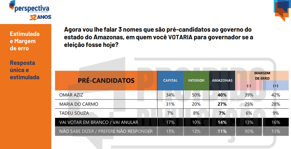 O senador Omar Aziz aparece com 34% das intenções de voto, seguido pela ex-deputada Maria do Carmo (31%) e por Tadeu Souza (7%). Brancos e nulos somam 17%, enquanto 11% não souberam responder .