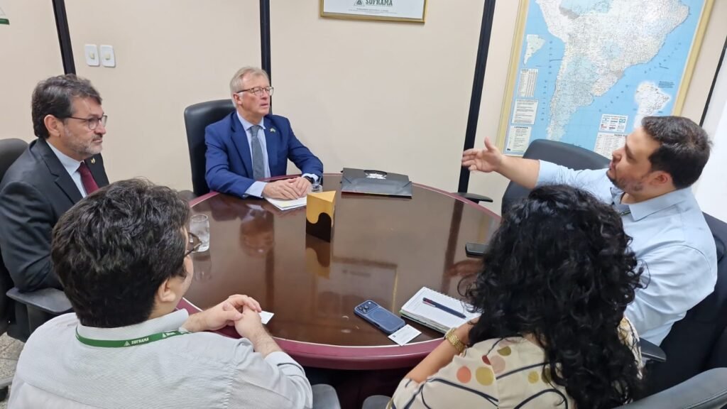 A Suframa recebeu o embaixador da Bélgica no Brasil, Chris Hoorn aert, em reunião voltada à prospecção de oportunidades bilaterais e ao entendimento do modelo de funcionamento da Zona Franca de Manaus (ZFM). O encontro foi conduzido pelo superintendente-adjunto Executivo da Suframa, Frederico Aguiar, na sede da Autarquia, em Manaus.