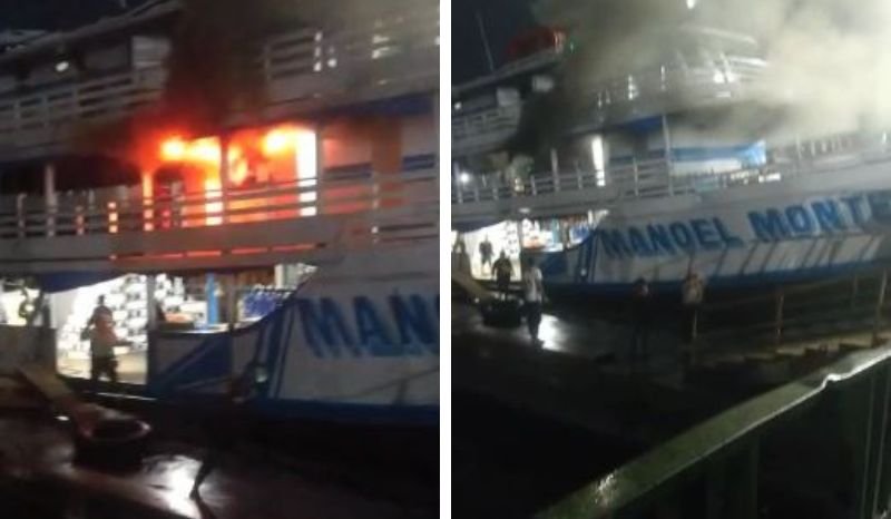 Em imagens compartilhadas nos aplicativos de mensagens é possível ver o fogo atingindo o segundo andar do barco chamado de ‘Manoel Monteiro’.