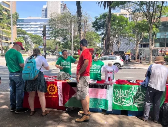O partido de extrema esquerda Causa Operária (PCO) vendeu camisas e bandeiras do grupo terrorista Hamas em manifestação, na Praça Oswaldo Cruz, no centro da cidade de São Paulo, neste domingo (12).