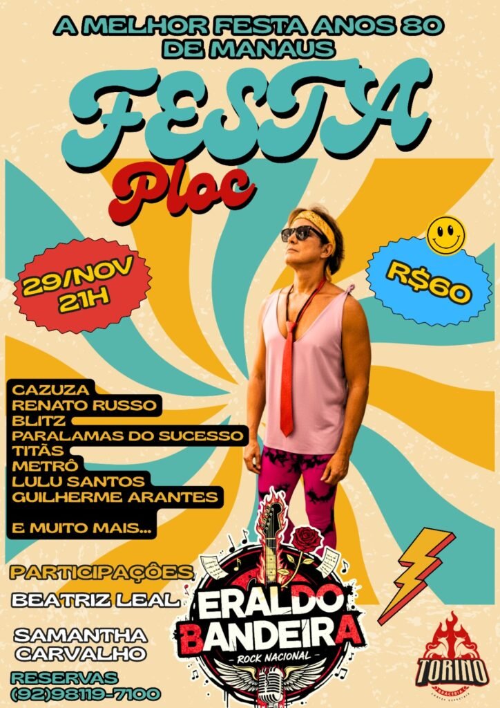Prepare-se para acender a memória afetiva, vestir sua melhor nostalgia e mergulhar em uma noite que celebra a década mais vibrante da música brasileira. No dia 29 de novembro (sábado), a Torino Braceria, no Soberane Mall, será palco da Festa Plooc, um super show comandado pelo cantor Eraldo Bandeira, que vai transportar o público direto para os anos 80 — época dourada do BRock, da ousadia criativa, das guitarras marcantes e das letras que ecoam gerações.