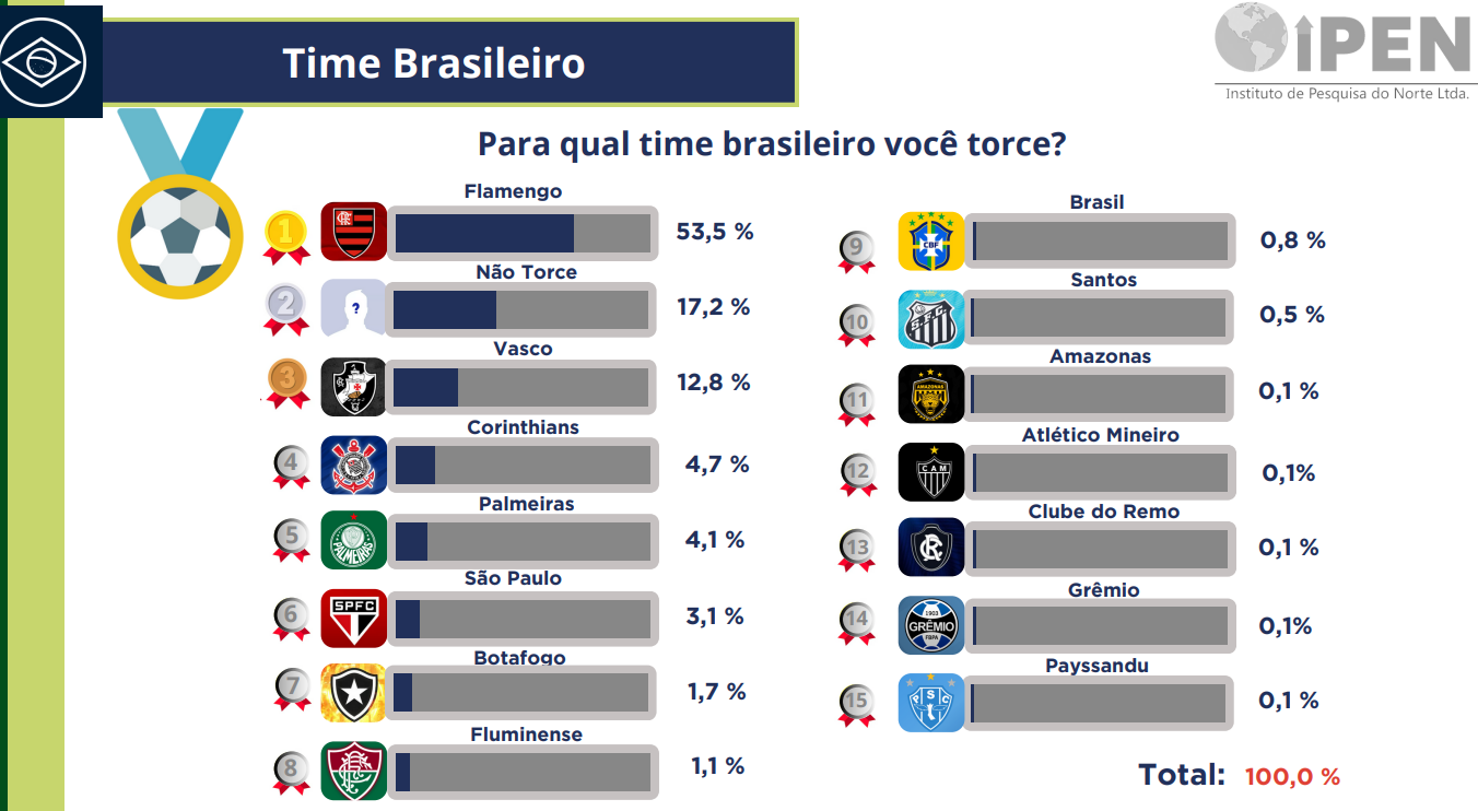 Na sondagem, os entrevistadores perguntaram: “Para qual time brasileiro você torce?”. O Flamengo foi citado por 53,5% dos participantes.