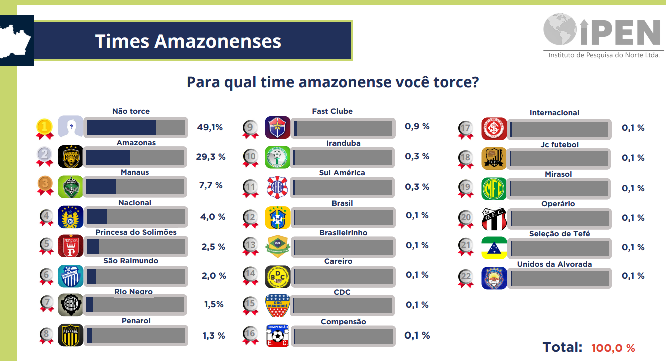 O Ipen também perguntou sobre os clubes amazonenses. Quase metade (49,1%) dos entrevistados disse não torcer para nenhum. O time mais lembrado foi o Amazonas FC (29,3%), que atualmente ocupa a lanterna da Série B do Campeonato Brasileiro.