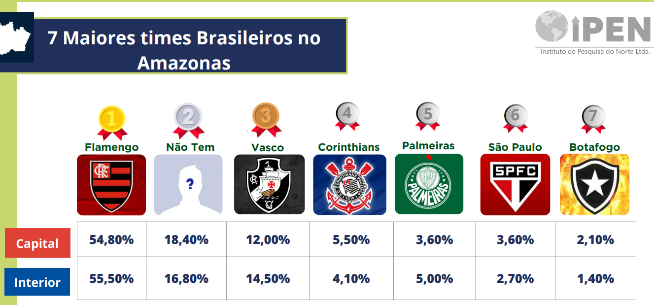 O Flamengo é o time brasileiro com mais torcedores no Amazonas, segundo pesquisa do Ipen (Instituto de Pesquisa do Norte) realizada em Manaus e em 11 municípios do interior.