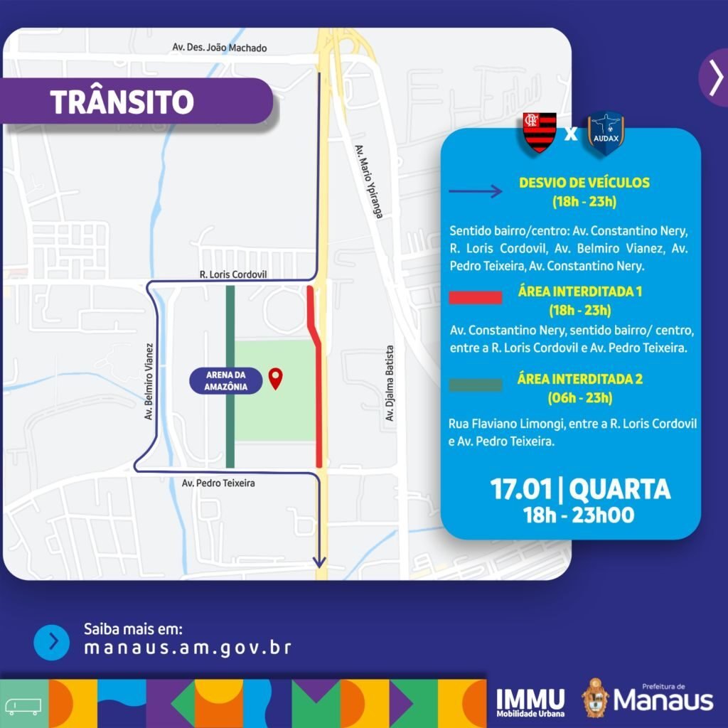 Vias que dão acesso à Arena da Amazônia sofrerão desvios no trânsito e nos transportes por causa do jogo do Flamengo entre Audax, na noite desta quarta-feira (17). A medida é para permitir que os torcedores acessem o estádio com segurança. As intervenções terão início a partir das 8h desta quarta-feira.