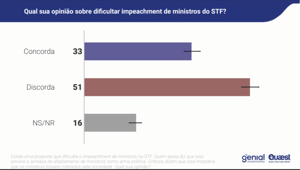 Pesquisa da Genial/Quaest divulgada nesta sexta-feira (18) aponta que 51% dos brasileiros discordam das medidas que dificultam o impeachment de ministros do Supremo Tribunal Federal (STF). O levantamento foi realizado entre os dias 11 a 14 de dezembro entrevistou 2004 pessoas. A margem de erro é de 2 pontos percentuais. 33% da população concorda sobre regras que dificultam o impeachment dos ministros do STF.
