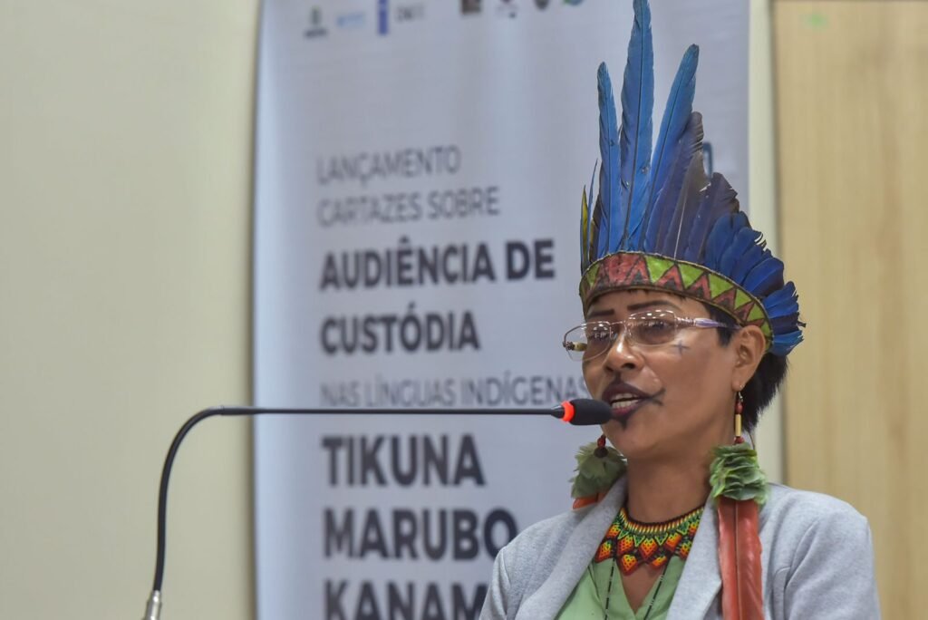 Ela ajudou a construir a tradução do cartaz sobre audiência de custódia na língua indígena de sua etnia e afirmou que é um momento histórico para a população indígena essa oportunidade da justiça.