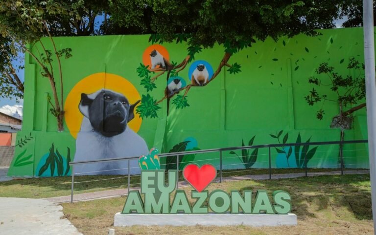 Símbolo da cidade ameaçado de extinção, o sauim-de-Manaus também está retratado nos muros do parque.