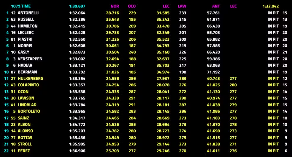 Em mais uma sessão dominada pela Mercedes, o jovem teve caminho aberto graças a um problema no carro de seu colega, Russell, no Q3. O piloto do carro 63 só pôde dar uma única volta para tentar a pole, enquanto Antonelli conseguiu trabalhar a estratégia ao longo dos 12 minutos para assegurar o resultado. Essa é a segunda pole da equipe alemã em 2026; Russell ficou na frente na Austrália.