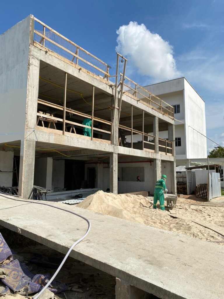 Já foram concluídos os serviços de construção da infraestrutura e da superestrutura do prédio, construção das vigas, pilares e colunas, além da alvenaria e instalações sanitárias.