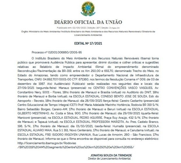 O Instituto Brasileiro do Meio Ambiente e de Recursos Naturais e Renováveis (Ibama) publicou no Diário Oficial da União (DOU) as datas das audiências públicas para a repavimentação da BR-319 (Manaus – Porto Velho).