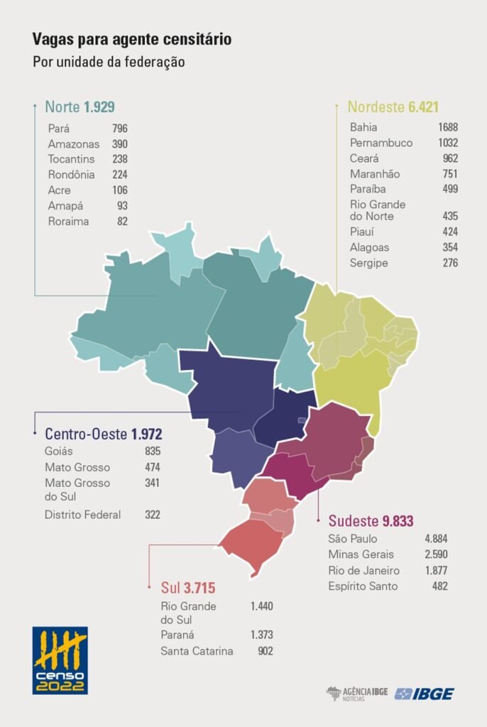 São 18.420 vagas para a função de Agente Censitário Supervisor e 5.450 vagas para a função de Agente Censitário Municipal, distribuídas em 4.409 municípios do país. Os contratos serão de 5 meses, podendo ser prorrogados.