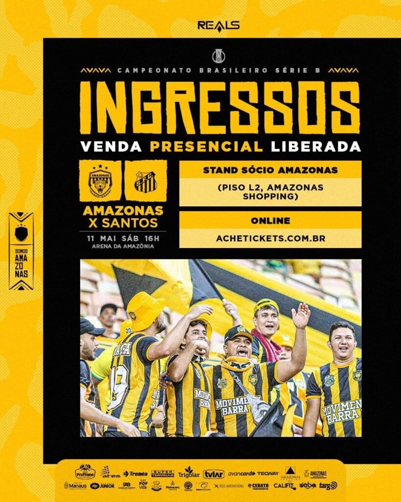 O Amazonas FC iniciou a venda de ingressos presencial para o confronto diante do Santos, válido pela quarta rodada da Série B do Brasileiro. O duelo será disputado na Arena da Amazônia, às 16h (horário de Manaus), no sábado (11). Os bilhetes custam a partir de R$ 30 e podem ser adquiridos no stand do Sócio Amazonas, no Amazonas Shopping, até o dia do jogo, às 12h (horário de Manaus).
