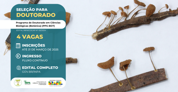 O Programa de Pós-Graduação em Ciências Biológicas (Botânica-PPG-BOT) do Instituto Nacional de Pesquisas da Amazônia (Inpa/MCTI) está com seleção aberta para quatro vagas no curso de Doutorado. As pesquisas do PPG-Botânica focam nas plantas, fungos e sua diversidade, evolução, ecologia, bioquímica, fisiologia e etnobotânica.