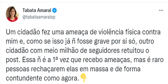 A deputada federal Tabata Amaral (sem partido – SP) usou as redes sociais para rebater as críticas feitas pelo ator José de Abreu. Ela disse que não é a primeira vez que sofre ameaças.