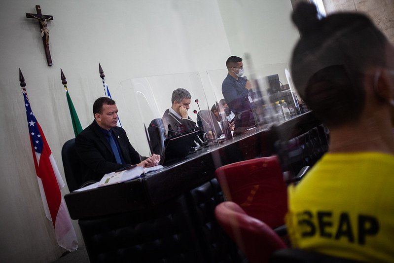 O julgamento da Ação Penal de n.º 0660058-02.2018.8.04.0001, realizado no Fórum Ministro Henoch Reis, começou às 10h, com a sessão presidida pelo juiz Mateus Guedes Rios.
