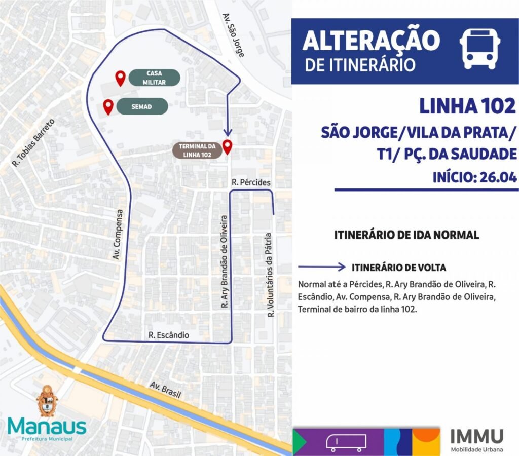 A Prefeitura de Manaus, por meio do Instituto Municipal de Mobilidade Urbana (IMMU), informa que a partir da próxima quarta-feira (26), a linha de ônibus 102 (São Jorge/Vila da Prata/T1/Praça da Saudade) terá parte do itinerário alterado no bairro Compensa, zona Oeste, no sentido Centro-bairro, para atender usuários do transporte público que transitam naquela região, principalmente a avenida Compensa.