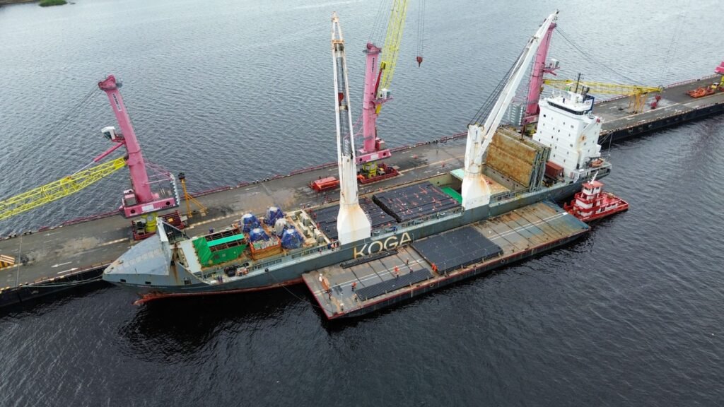 Chegou ao Porto Chibatão, na zona sul de Manaus, nesta terça-feira (9), o navio Koga Solution, o primeiro vindo da China, com tubos destinados ao Complexo Termelétrico Azulão 950, da empresa concessionária de gás natural Eneva, em Silves – distante 204 km da capital amazonense. As usinas terão capacidade de abastecer 3,8 milhões de residências.