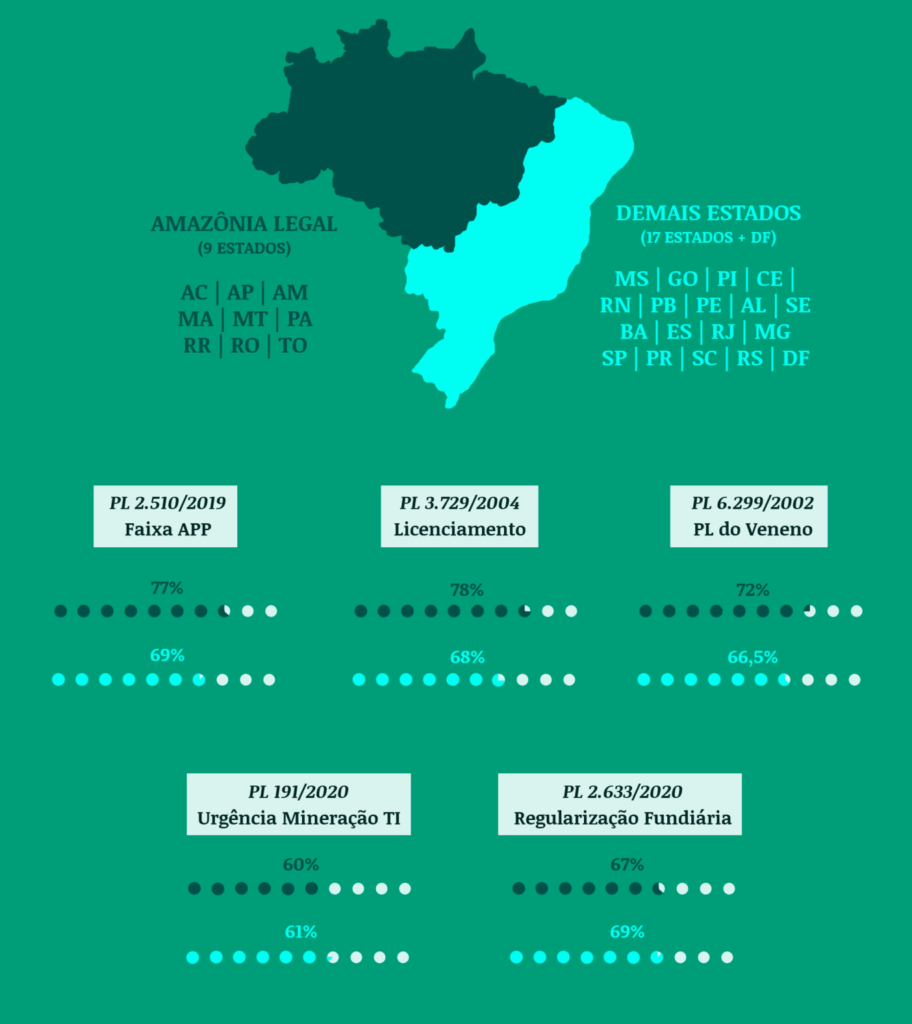 Na votação da urgência do PL 191/2020, que libera a mineração em Terras Indígenas, por exemplo, 60% dos deputados dos estados da Amazônia Legal foram a favor da norma. A porcentagem de deputados favoráveis à mudança no resto do Brasil e no Distrito Federal foi de 61%.