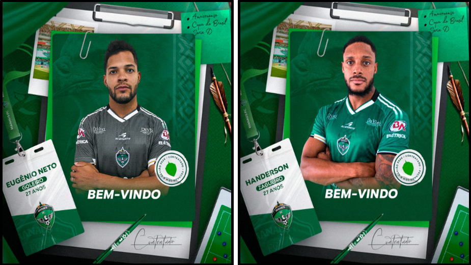 O Manaus confirmou a contratação do goleiro Eugênio Henrique Neto e do zagueiro Handerson Santos Lemos, ambos de 27 anos e com passagem recente pelo Monte Azul-SP. Os atletas chegam para reforçar o elenco na temporada 2026, quando o clube disputará o Campeonato Amazonense e a Série D do Campeonato Brasileiro.