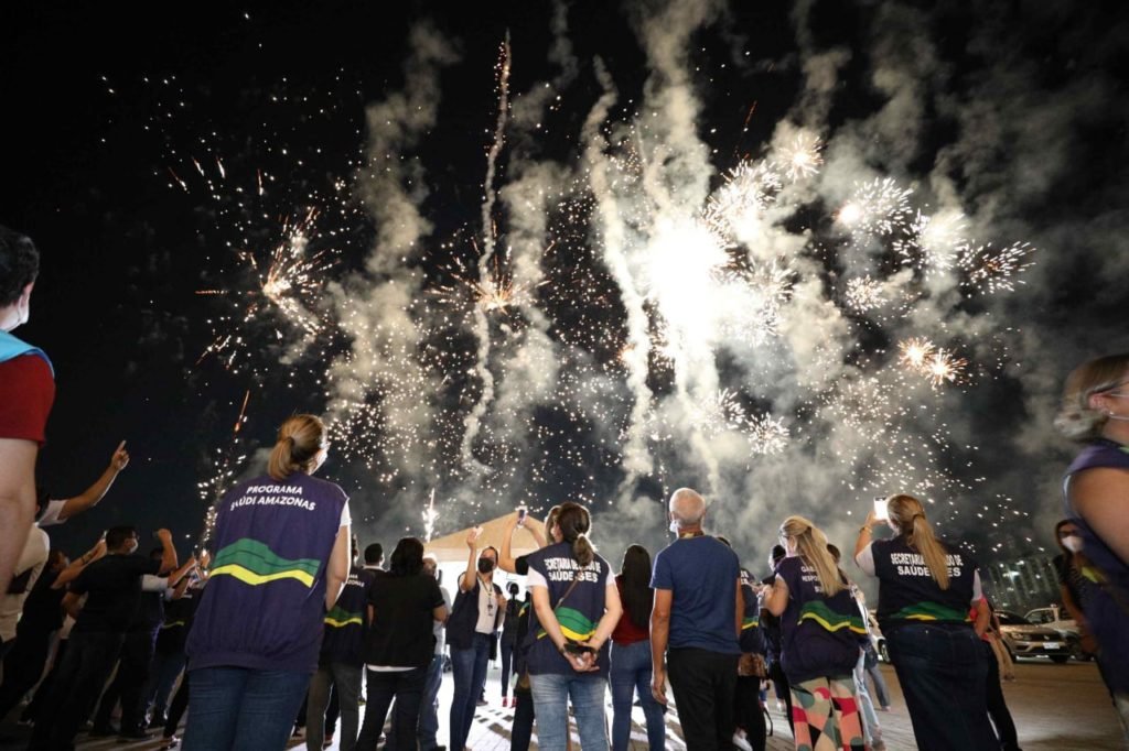 Uma queima de fogos encerrou o mutirão de vacinação com viradão que começou no sábado e terminou na noite deste domingo