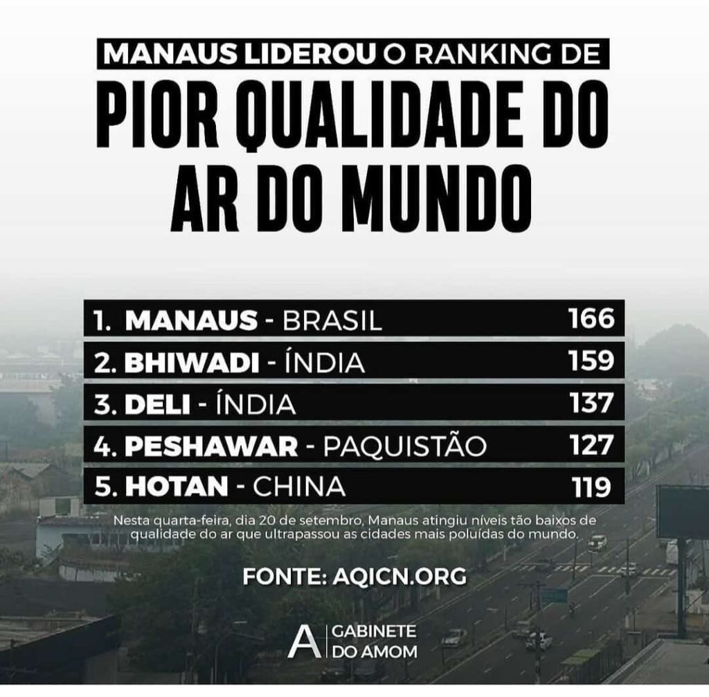 De acordo com o relatório IQAir, referente a 2022, as cidades com a pior qualidade de ar do mundo são: Lahore (Paquistão), Hotan (China), Bhiwadi (Índia), Deli (Índia) e Peshawar (Paquistão). Ao menos por um momento, Manaus ficou em primeiro lugar entre as piores.