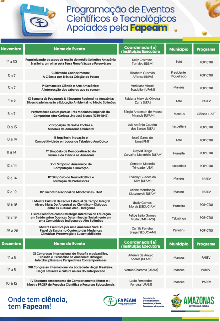 A agenda de eventos científicos do segundo semestre de 2025, apoiados pelo Governo do Amazonas, por meio da Fapeam, pode ser acessada em: https://www.fapeam.am.gov.br/programacao-de-eventos-cientificos-e-tecnologicos-apoiados-pela-fapeam/