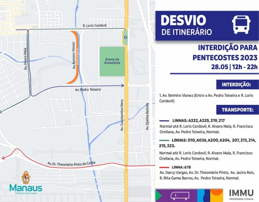 A Prefeitura de Manaus, por meio do Instituto Municipal de Mobilidade Urbana (IMMU), vai interditar a rua Flaviano Limongi, entre a Arena da Amazônia e o sambódromo, zona Centro-Oeste, a partir das 6h30 deste domingo (28), no trecho entre a rua Lóris Cordovil e avenida Pedro Teixeira, onde será realizado o evento religioso Pentecostes.