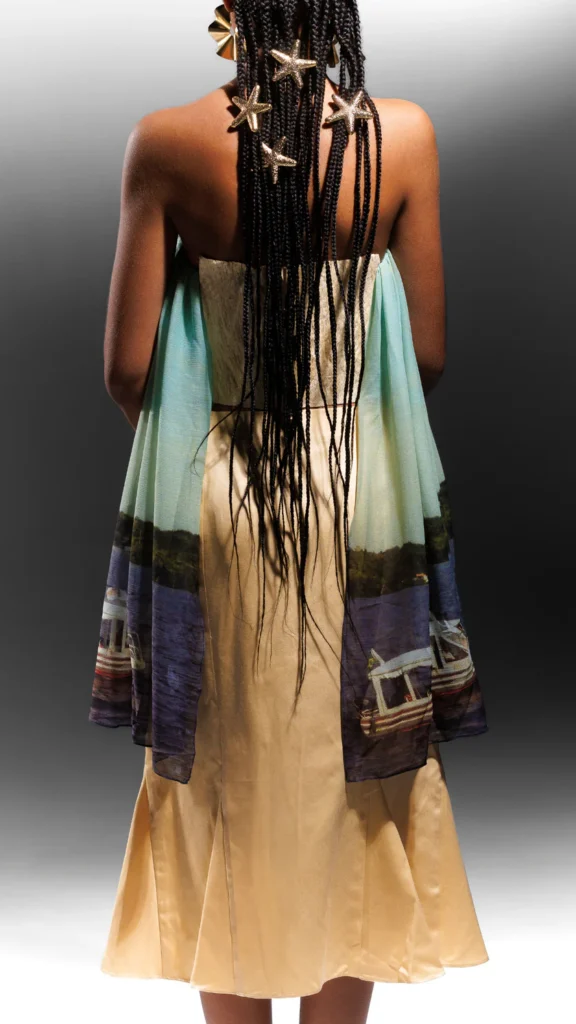 A primeira coleção da marca, intitulada Criptídeos, se constrói justamente nesse território híbrido entre o real e o imaginário. Inspirada em mitologias aquáticas e nas narrativas orais da Amazônia, a coleção explora figuras de metamorfose – criaturas que transitam entre mundos, como a sereia. A proposta é traduzir esse imaginário em silhuetas, texturas e materiais que evocam a fluidez da água e a organicidade da floresta.