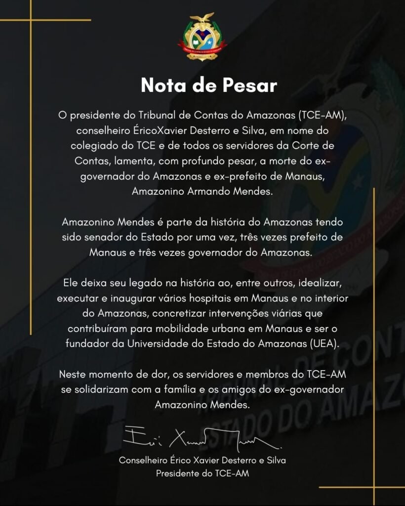 O Tribunal de Contas do Estado do Amazonas (TCE-AM) também emitiu nota de pesar, pela morte de Amazonino.
