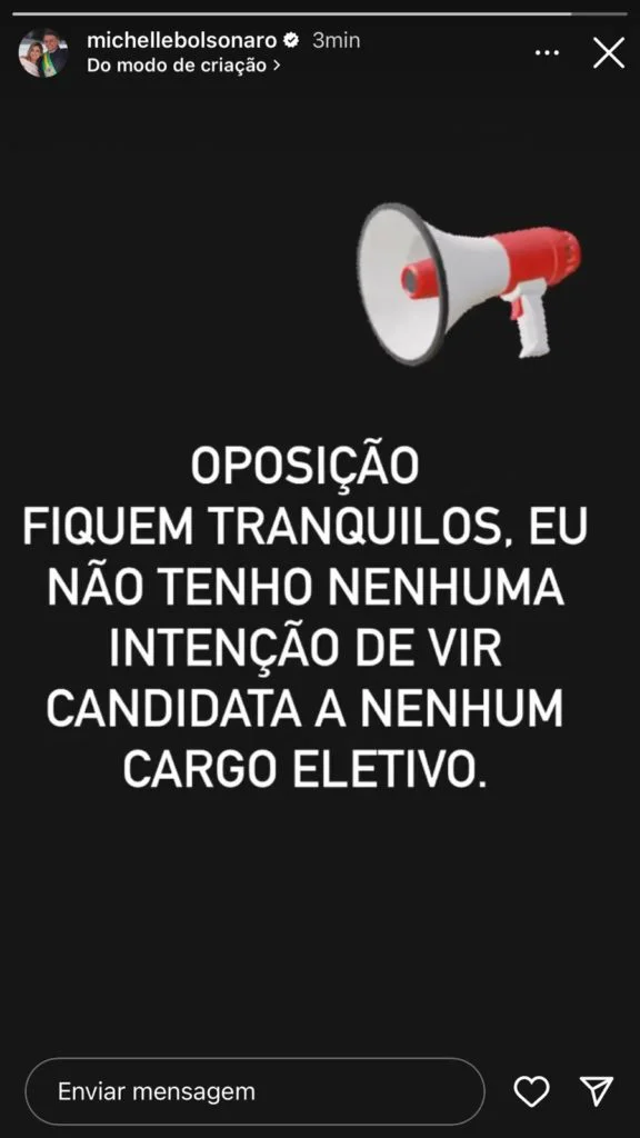pós especulações de uma possível candidatura a presidente da República, ex-primeira-dama, Michelle Bolsonaro, anunciou em sua conta do Instagram que não tem intenção alguma de ocupar o cargo.