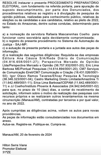 Na Portaria, o promotor determinou a requisição, no prazo de dez dias, a contar do recebimento da solicitação, que empresas de pesquisa informem sobre o motivo da realização das pesquisas com recursos próprios e se realizaram outros levantamentos na mesma circunscrição, contratadas por terceiros e por qual valor, no ano de 2022.
