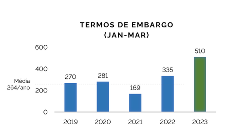 As apreensões de bens e produtos relacionados às infrações ambientais tiveram alta de 133% e o número de embargos de propriedades cresceu 93% no mesmo período.