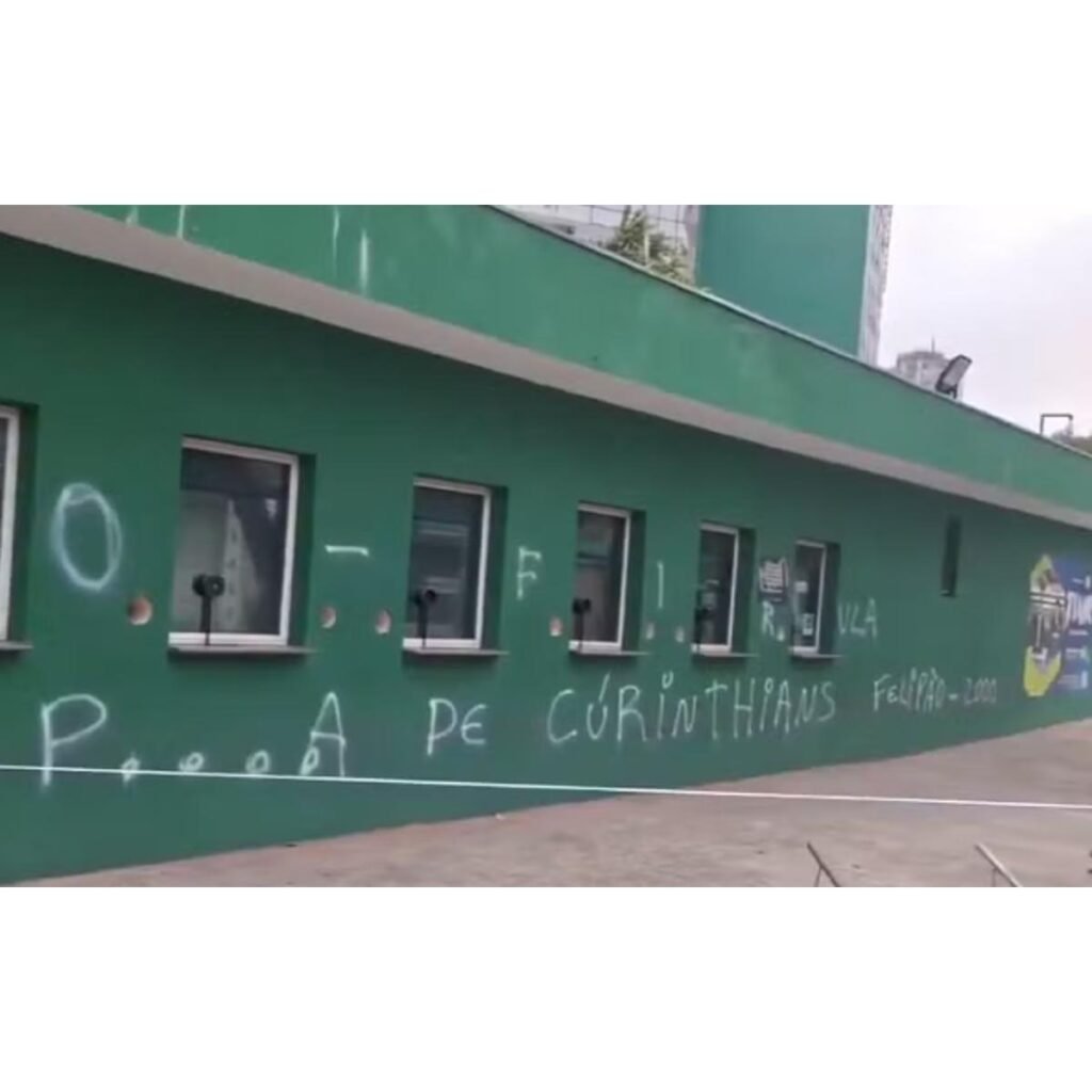 Entre as frases escritas estavam: “Abel, acabou a magia? 2025 de novo”, “Cadê o planejamento? Time sem vergonha” e ofensas direcionadas à dirigente do clube. Em uma das mensagens, a palavra “acabou” foi grafada de forma incorreta.