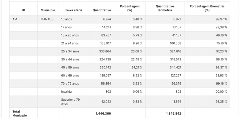 De acordo com os números, 93,05% dos eleitores de Manaus já estão cadastrados com biometria. O prazo para eleitoras e eleitores regularizarem o título se encerrou no dia 8 de maio.