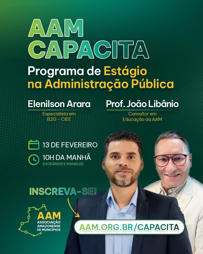 As inscrições para participação no evento podem ser feitas pelo link aam.org.br/capacita. O supervisor do CIEE, Elenilson Arara, especialista em B2G (Business to Government) irá apresentar as diretrizes, benefícios e procedimentos para implantação do Programa de Estágio na Administração Pública Municipal. O foco é orientar prefeitos, secretários e servidores sobre como estruturar e ampliar oportunidades de estágio nas prefeituras das cidades do Amazonas.