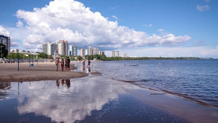 Salva-vidas estão na praia para prevenção e possível necessidade de resgate nas águas. Desde 2011, a praia não desaparece mais por completo sob as águas do Negro durante a enchente.
