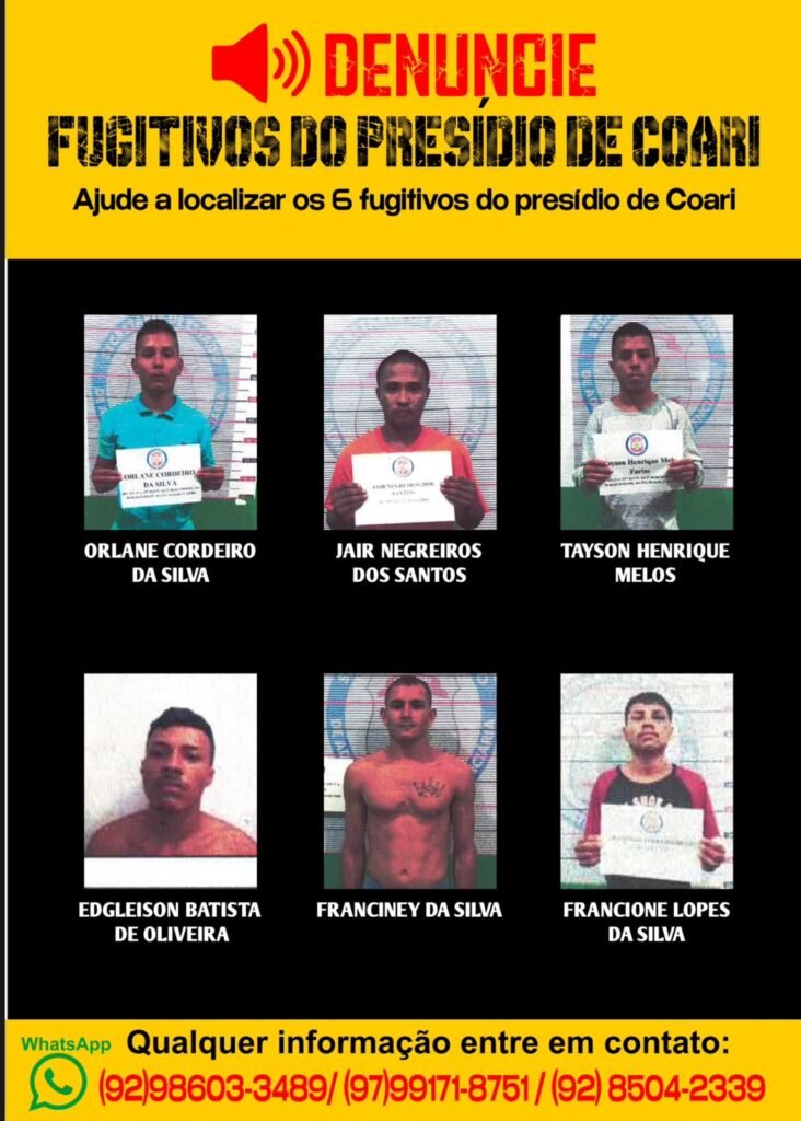 Imagens dos seis detentos que fugiram da Unidade Prisional (UP) de Coari (a 363 quilômetros a oeste de Manaus), foram divulgadas nesta quinta-feira (3).