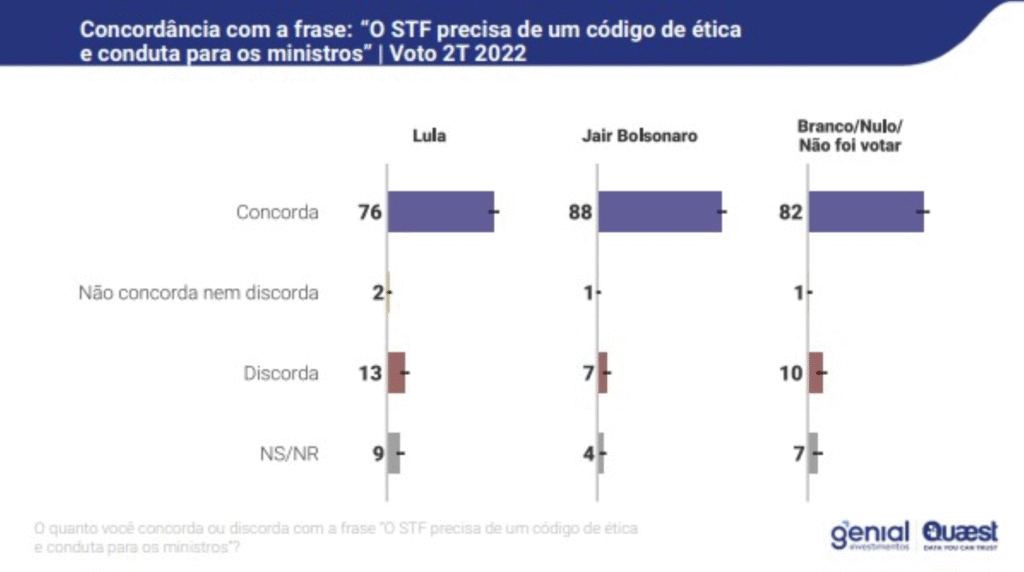 A maioria dos brasileiros defende que o Supremo Tribunal Federal (STF) adote um Código de Ética para seus ministros. É o que aponta a pesquisa Genial/Quaest, divulgada nesta quinta-feira (12), segundo a qual 82% dos entrevistados apoiam a medida.
