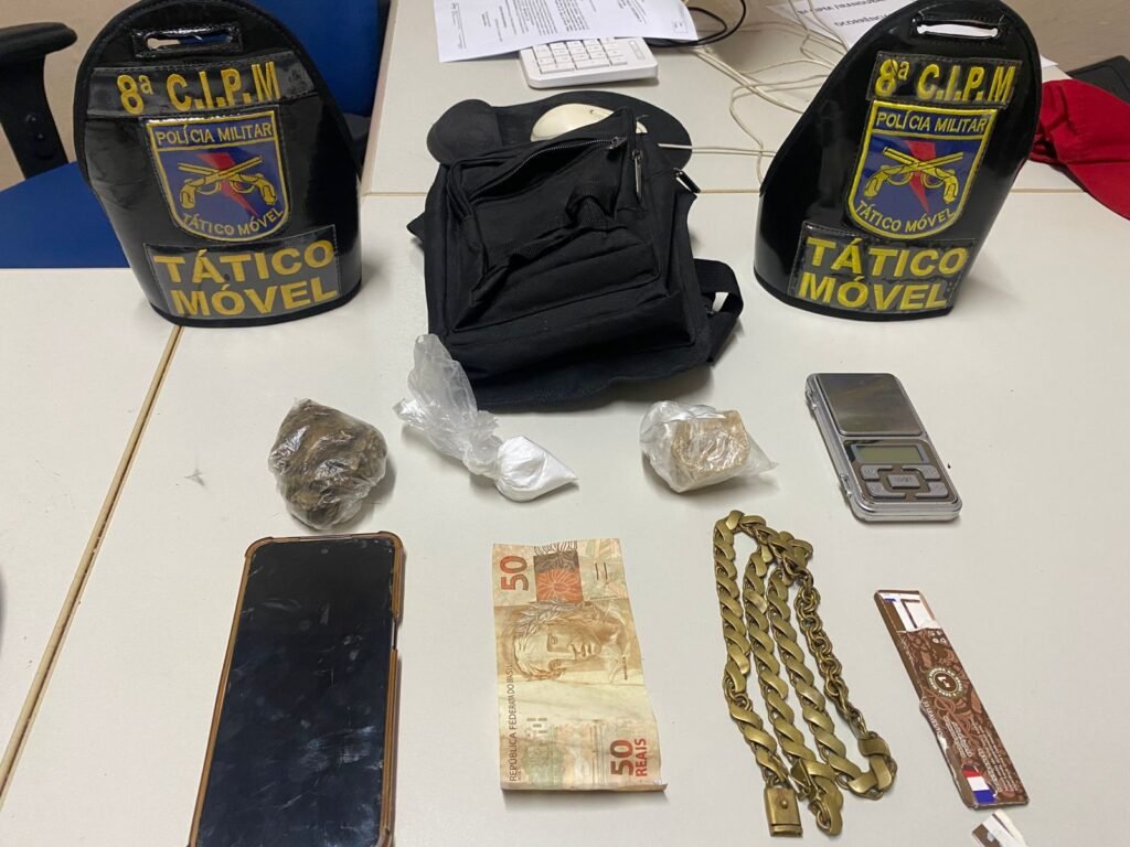 Com ele foram apreendidos uma bolsa (modelo pochete), contendo o material ilícito, diante dos fatos foi dado voz de prisão e o mesmo foi encaminhado para o 31 DIP .