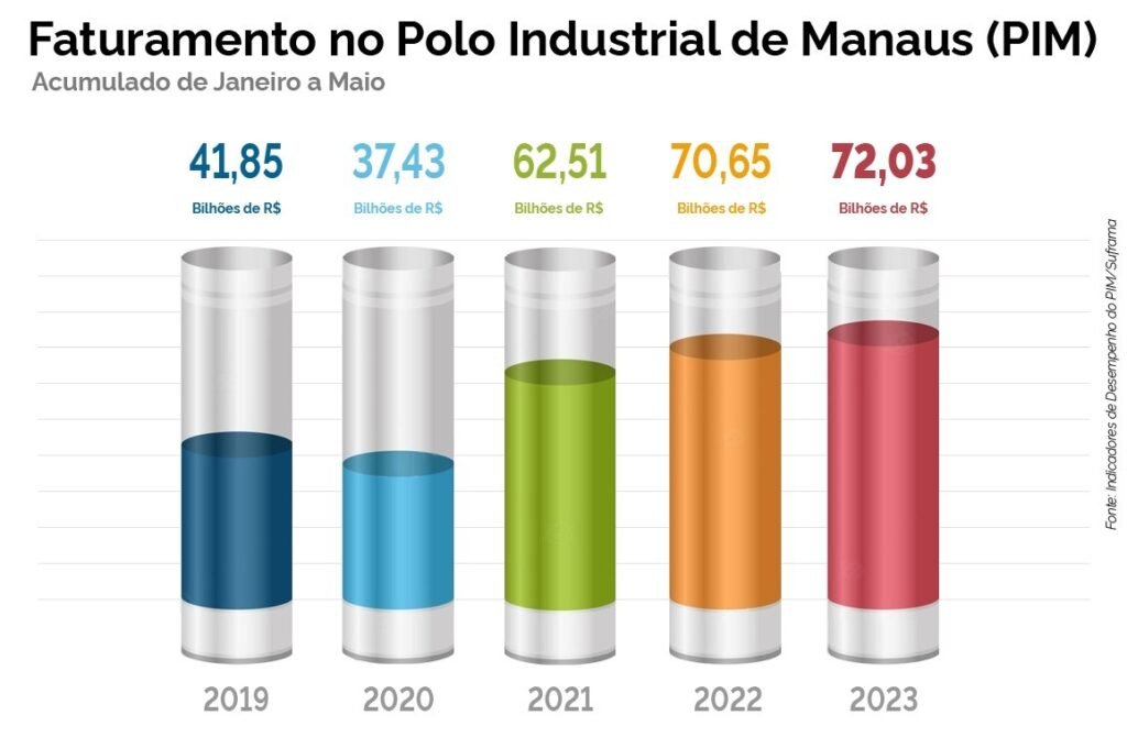 O Polo Industrial de Manaus (PIM) faturou R$ 72,03 bilhões nos cinco primeiros meses deste ano, um crescimento de 1,96% na comparação com o mesmo período de 2022 (R$ 70,65 bilhões). Em dólar, o faturamento do parque industrial amazonense atingiu US$ 14.13 bilhões e registrou queda de 1,22% ante igual período do ano passado (US$ 14.31 bilhões).