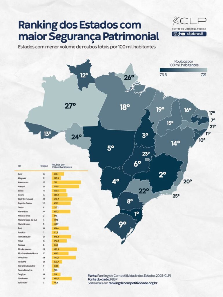 O primeiro lugar com a maior segurança patrimonial é Santa Catarina, que tem um dos menores índices de roubo do Brasil. “Enquanto lá o povo anda tranquilo, aqui a gente vive com medo, refém da violência, das facções e da falta de comando”, afirmou a pré-candidata, destacando que Santa Catarina é governada por um governador de direita e do seu partido, o Partido Liberal.