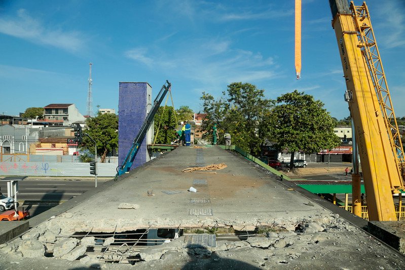 A Prefeitura de Manaus começou neste domingo (3), à demolição total da antiga passarela da Avenida Torquato Tapajós, em frente à estação Santos Dumont, zona Centro-Oeste da cidade. A estrutura, danificada desde julho do ano passado após a colisão de uma carreta-cegonha que ultrapassou o limite de altura permitido, começa agora a dar lugar a uma nova obra mais alta, moderna e acessível.