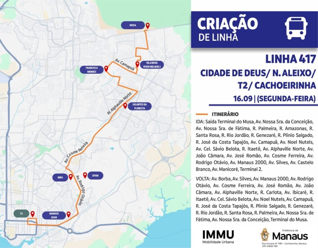 A Prefeitura de Manaus, por meio do Instituto Municipal de Mobilidade Urbana (IMMU), começa a operarar, a partir da próxima segunda-feira (16), a nova linha 417, que ligará a zona Leste à zona Sul da cidade. O novo etinerário atenderá os moradores dos bairros Cidade de Deus, Nossa Senhora de Fátima, Nossa Senhora da Conceição e Viver Melhor 2, e seguirá em direção ao Terminal da Cachoeira (T2), no bairro Cachoeirinha.